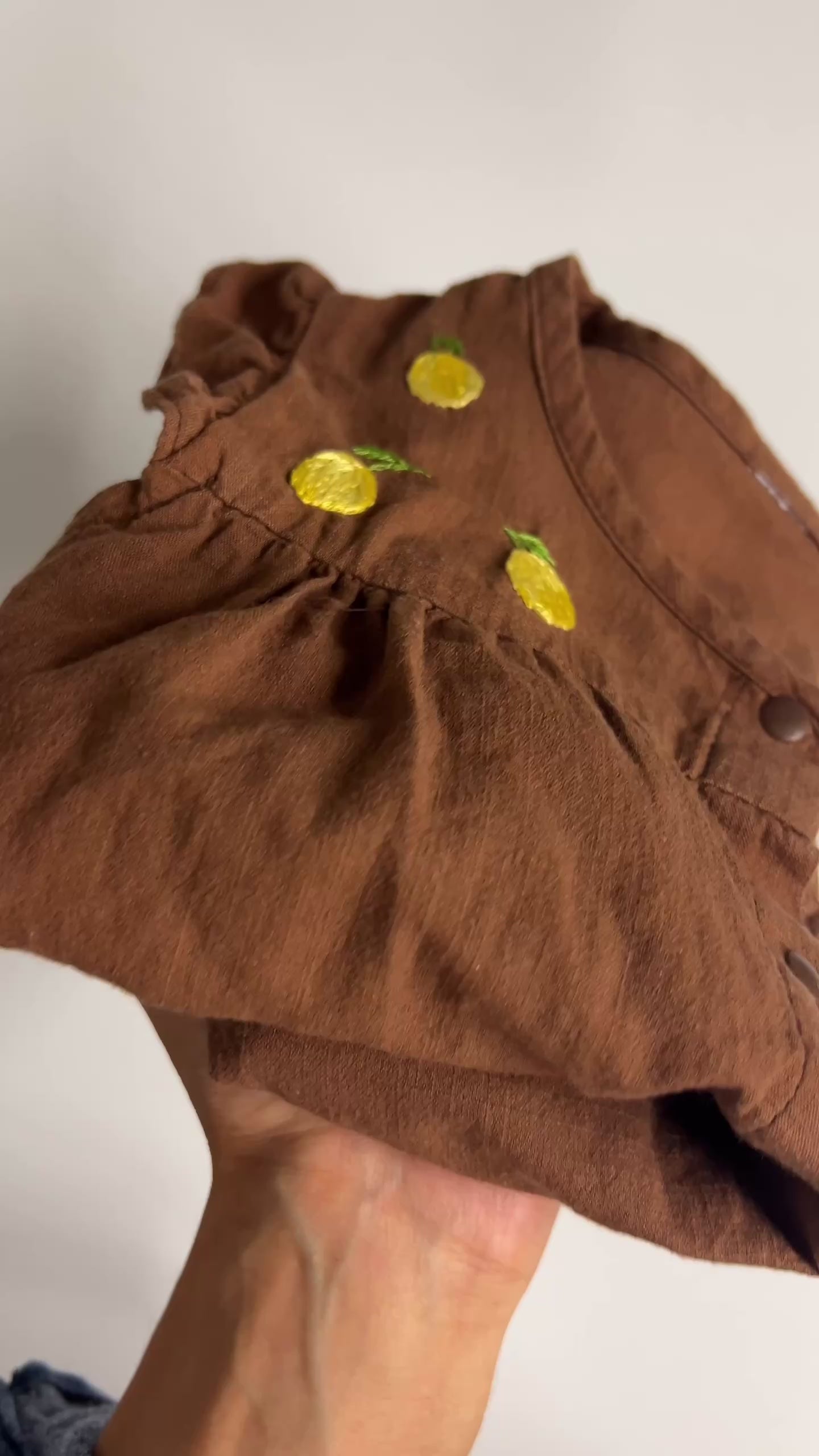 This piece combines a warm earthy tone with cheerful handmade detail. The soft gathered shape, delicate sleeve ruffles, and embroidered fruit motif give it a charming artisan feel while keeping the look simple and wearable.